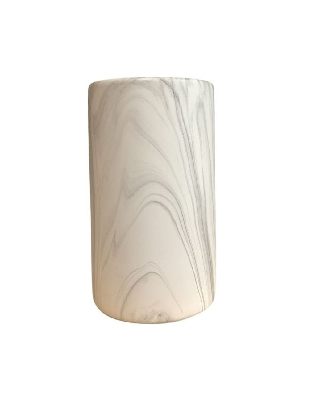 Figura decorativa en forma cilíndrica, con acabado tipo mármol. Diseñada para aportar volumen y altura visual en estanterías, mesas auxiliares o repisas. Su forma simple y su presencia sólida permiten integrarla en distintos estilos sin recargar el espacio.