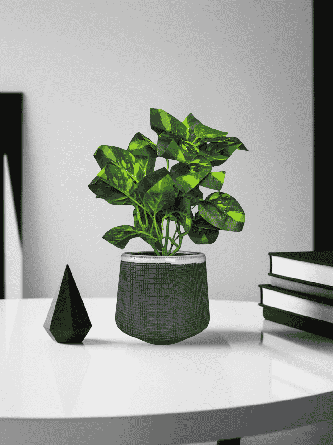 Este macetero de cerámica en color gris oscuro destaca por su original textura tipo panal en relieve, que aporta profundidad y un toque contemporáneo a cualquier espacio. Su acabado mate y su forma cónica invertida lo convierten en una pieza decorativa versátil, ideal para resaltar plantas naturales, artificiales o arreglos florales con un estilo moderno y elegante.