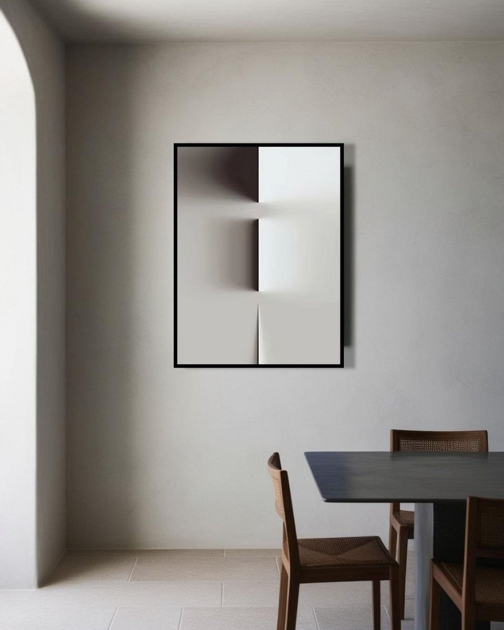Composición abstracta en tonos monocromáticos que juega con luces, sombras y profundidad. El diseño plegado crea una transición visual suave sobre el lienzo, aportando movimiento sin perder sobriedad.
