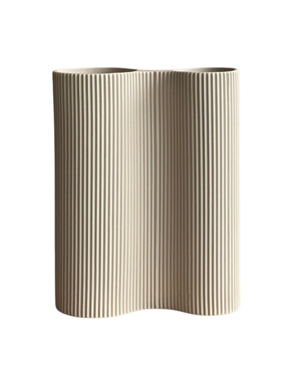 Este jarrón de cerámica blanca destaca por su silueta alargada y estilizada, con una base curva que se estrecha progresivamente hasta formar un cuello delgado y elegante. Su acabado liso con sutiles texturas horizontales aporta un aire refinado y contemporáneo. Ideal como pieza decorativa independiente en espacios amplios o junto a arreglos florales altos, este jarrón aporta verticalidad y sofisticación a cualquier ambiente.