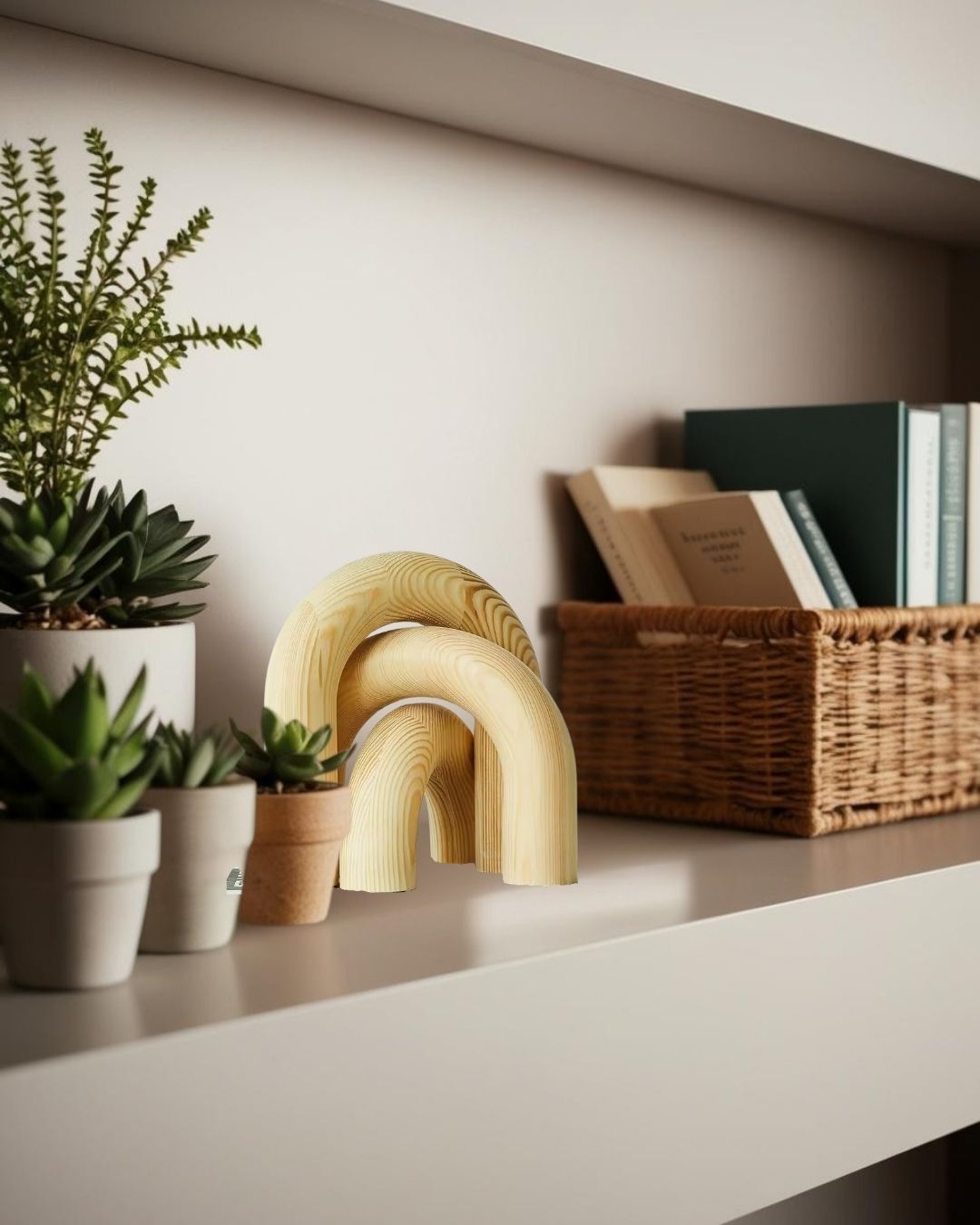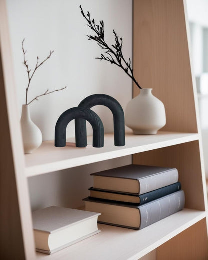 Set de figuras decorativas con forma de arco, elaboradas en madera. Su diseño curvo y simple permite integrarlas fácilmente en repisas, escritorios o estanterías. Ideales para añadir ritmo visual sin sobrecargar el espacio.